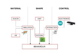 By developing a model of integration between soft silicone layers, digitally controlled air pressure and computationally generated geometric patterns, the students experimented with the creation of ecologies of interaction between geometry, materiality and interactive control systems.